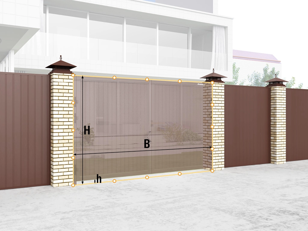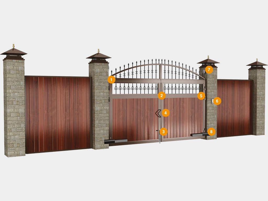 Комплектация включает алюминиевые навесные столбы, задвижку в землю, комплект профилей и панелей с ручкой, возможно дополнение электроприводом.